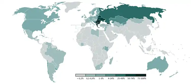 Більшість членів сьогодні зосереджені в Південній Європі, Східній Європі та Азіатській Росії, крім значних меншин у Центральній Азії та Леванті, хоча Східне православ'я поширилося у глобальну релігію до Західної Європи та Нового Світу, а церкви в більшості країн і основні міста. Прихильники становлять найбільшу єдину релігійну віру в найбільшій країні світу — Росії, де проживає приблизно половина східних православних християн. Вони є релігією більшості в Україні, Румунії, Білорусі, Греції, Сербії, Болгарії, Молдові, Грузії, Північній Македонії, Кіпрі та Чорногорії. Значні меншини східних православних присутні в Боснії та Герцеговині (абсолютна більшість у Республіці Сербській), Латвії, Естонії, Казахстані, Киргизії, Лівані, Албанії, Сирії та багатьох інших країнах.