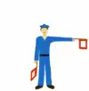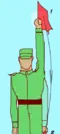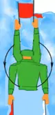 | Команда «Усі праворуч» (ліворуч) подається для одночасного повороту у зазначеному напрямку під час руху; після виконання — рух продовжується у новому напрямку за сигналом (випростати ліву руку (червоний прапорець) горизонтально убік, а праву руку (жовтий прапорець) підняти вгору, повернутися в бік повороту і розмахувати правою рукою вгору і вниз до рівня плеча (повторювати до відклику)). | |