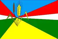 Прапор являє собою прямокутне полотнище та складається з вісьмох трикутників, розміщених за годинниковою стрілкою в такому порядку: спочатку синій, червоний, білий, зелений, жовтий, а потім зелений, білий та червоний. Синій та жовтий трикутники розміщені основами до верхнього і нижнього країв, відповідно.