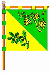 Квадратне полотнище, розділене з верхнього кута від древка по діагоналі на два рівновеликі поля, у верхньому зеленому полі жовта виноградна лоза з гроном і листками, у нижньому жовтому полі — зелена гілка дуба з жолудями і листками.