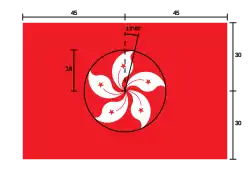 Прямокутне полотнище червоного кольору. У центрі стилізоване зображення квітки баугінії (Bauhinia) білого кольору з п'ятьма пелюстками зігнутими в напрямку годинникової стрілки. У кожній пелюстці зображена червона зірка, від якої до центру відходить червона вигнута лінія, яка разом із зіркою нагадує тичинки квітки. Квітка вписана в коло діаметром 3/5 від ширини прапора. Відношення ширини прапора до довжини — 2:3. Зворотний бік прапора є дзеркальним відображенням лицьового боку.