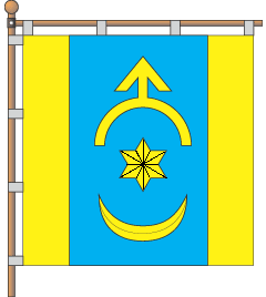 Квадратне полотнище, на синьому тлі вертикально розташовані жовті фігури — 6-променева зірка, під нею півмісяць, над ними — острога; від древка та з вільного краю прапор має жовті лиштви (шириною у 1/5 сторони прапора).