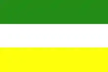 Квадратне полотнище, розділене по діагоналі з верхнього вільного кута на два рівні трикутні поля, у верхньому жовтому — гілка калини з двома листками та червоним кетягом, нижнє поле червоне. Зворотна сторона прапора має дзеркальне зображення до основної сторони.