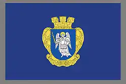 - Прапор міста Києва являє собою прямокутне полотнище синього кольору з зображенням у його центральній частині на відстані 3/10 довжини від древка постаті Архангела Михаїла, обрамлене золотою смугою з бахромою. Відношення ширини прапора до його довжини — 2:3.