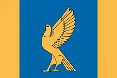 опис «Прямокутне полотнище із співвідношенням ширини до довжини 2: 3, що складається з трьох вертикальних смуг жовтого, синього і жовтого кольору (ширина кожної жовтої смуги 1/6 довжини полотнища); в середині синьої смуги стоїть, звернений до древка, з піднятими крилами степової сокіл-сапсан жовтого кольору ».