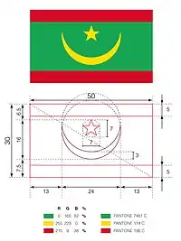 Прапор Мавританії являє собою прямокутне полотнище зеленого кольору з червоними смугами вгорі і знизу, в центрі якого горизонтально розташований півмісяць і п'ятикутна зірка над ним жовтого кольору. Зелений колір прапора і півмісяць із зіркою символізують іслам, основну релігію країни, жовтий колір півмісяця і зірки — пустелю Сахара. Крім того, жовтий і зелений кольори є панафриканськими. Червоні смуги символізують зусилля і жертви, які принесли жителі Мавританії, щоб захищати свою землю.