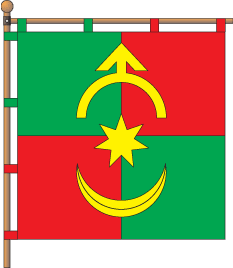 Квадратне полотнище розділене на чотири рівні частини — від древка зелену і червону, від вільного краю червону і зелену. На полотнищі жовта семипроменева зірка, над якою жовта острога і під якою жовтий півмісяць.