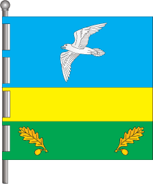 Квадратне полотнище, яке складається з трьох горизонтальних смуг — синьої, жовтої та зеленої у співвідношенні 2:1:1. На верхньому синьому полі біла чайка, яка летить, на нижньому зеленому полі обабіч жовті жолуді із стеблом і листям.