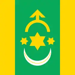 Квадратне полотнище, на зеленому тлі жовта 6-ти променева зірка, обабіч неї дві жовті 6-променеві зірки меншого розміру, під ними білий півмісяць, над ними — жовта острога; від древка та з вільного краю прапор має жовті лиштви (шириною в 1/5 сторони прапора).