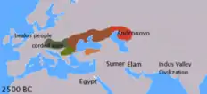 ![]() Можливе поширення праіндоєвропейської мови бл. 3500 року до н. е. за Курганною теорією |