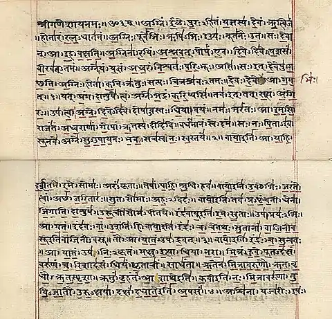 | Індоарійські мови | Рігведа була складена в Індії у кінці II тисячоліття до н. е. Усна традиція ведичних текстів, що сягає II тисячоліття н. е. Високий релігійний авторитет текстів не дозволяв суттєвих змін у мову пам'ятки, тож тут у незмінному стані збереглися деякі мовні елементи з прадавніх часів. |