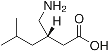 Прегабалін — синтетичний лікарський препарат, який за хімічною структурою є структурним аналогом гамма-аміномасляної кислоти, яка є гальмівним медіатором у ЦНС.[12][13][14] Незважаючи на те, що прегабалін є хімічним аналогом ГАМК, механізм його дії відрізняється від механізму дії інших препаратів, які взаємодіють із ГАМК-рецепторами. Дослідженнями встановлено, що прегабалін не взаємодіє із А- і В-ГАМК-рецепторами, і точний механізм дії препарату натепер не встановлено.[2] Основним механізмом дії прегабаліну вважається зв'язування із потенціал-чутливими кальцієвими каналами, зокрема із α2δ-1-субодиницею кальцієвих каналів, що може забезпечувати його знеболювальну дію.[15] Прегабалін може застосовуватися як допоміжний препарат при лікуванні парціальних епілептичних нападів[2][16], але основним використанням препарату є лікування невропатичного болю (включно із постгерпетичним болем та діабетичною невропатією)[17][2][15], а також при фіброміалгії.[18][3][4] У частині клінічних досліджень вказано також ефективність прегабаліну при дискогенній попереково-крижовій радикулопатії.[19] Прегабалін також застосовується для лікування генералізованого тривожного розладу.[15][20][21], щоправда, проте не рекомендований для лікування інших розладів психіки.[22] Окрім цього, тривале та безконтрольне застосування прегабаліну може призводити до фізичної та психологічної залежності від препарату.[20][21]