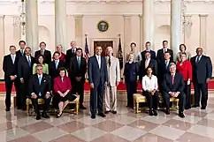 Після його інавгурації Обама та Сенат працювали над підтвердженням своїх кандидатур в Уряд Сполучених Штатів. Три офіцери на рівні кабінету не потребували підтвердження: віце-президент Джо Байден, якого Обама обрав своїм керівником на Демократичній національній конвенції 2008 року, начальник штабу Рам Емануель та міністр оборони Роберт Гейтс, якого Обама вирішив залишити від попередньої адміністрації.[7] Ранній список пропозицій надійшов від Майкла Фромана, тодішнього керівника Citigroup.[8] Обама описав вибір свого кабінету як «команду суперників», і Обама обрав декількох видатних державних чиновників на посади уряду, включаючи колишню первинну конкурентку Хілларі Клінтон на посаду державного секретаря.[9] Обама призначив декількох колишніх чиновників адміністрації Клінтона в Уряд та на інші посади.[10] 28 квітня 2009 року Сенат підтвердив колишнього губернатора штату Канзас Кетлін Сібеліус на посаді секретаря з питань охорони здоров'я та соціальних служб, доповнивши початковий кабінет Обами.[11] Під час президентства Обами чотири республіканці служили в кабінеті Обами: Рей ЛаХуд в якості міністра транспорту Роберт Макдональд як міністр у справах ветеранів, а Гейтс і Чак Гейгл — секретарі оборони.