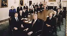 Мак МакЛарті, давній друг Клінтона, який керував успішною діловою кар'єрою і обіймав посаду голови Арканзаської демократичної партії, став першим начальником штабу Клінтона. Клінтон переконав Ллойда Бентсена, давнього сенатора від Техасу та кандидата на посаду віце-президента демократів 1988 року, виконувати функції першого секретаря казначейства. На початку першого терміну Клінтона, Бентсен, директор OMB Леон Панетта, міністр праці Роберт Райх та координатор політики Роберт Рубін були головними економічними радниками Клінтона. Перший термін зовнішньополітичної команди Клінтона очолив Радник національної безпеки Ентоні Лейк та держсекретар Воррен Крістофер, обидва вони служили в адміністрації Картера. Віце-президент Гор та перша леді Хілларі Клінтон стали двома найвпливовішими діячами адміністрації Клінтона, і Клінтон висловив свою думку щодо широкого кола питань.