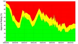 Коли він пішов з посади в 1953 році, американська громадськість розглядала Трумена як одного з найпопулярніших керівників в історії. Його рейтинг затвердження роботи — 22 % в опитуванні «Геллапа» у лютому 1952 р. Був нижчим за 24 % Річарда Ніксона в серпні 1974 року, місяця, коли Ніксон подав у відставку після скандалу з Вотергейтом. У 1952 році журналіст Семюель Любел заявив, що «після семи років бурхливої, навіть лютої діяльності Трумена, нація, здавалося, опинилася на тому самому загальному місці, що і коли він вперше прийшов на посаду… Ніде в цілому запис може вказувати на єдиний, рішучий прорив… Усі його вміння та енергія — і він був одним із наших найпрацьовитіших президентів — були спрямовані стояти на місці».[16] У роки міських заворушень у 1960–70-х роках історики-ревізіоністи зліва атакували його зовнішню політику як занадто ворожу комунізму, а внутрішню політику як занадто сприятливу для бізнесу. Однак образ Трумена в університетських підручниках був досить сприятливим у 50-х роках, а більш усталені вчені ніколи не приймали критики істориків-ревізіоністів.