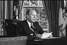 8 вересня 1974 року Форд видав Прокламацію 4311,[9] яка дала Ніксону повне і безумовне помилування за будь-які злочини, які він, можливо, вчинив проти США під час президентства.[10] У телевізійному ефірі нації Форд пояснив, що вважає, що помилування є в найкращих інтересах країни, і що ситуація в сім'ї Ніксонів «- це трагедія, в якій всі ми грали роль. Це може продовжуватись і продовжуватись, або хтось повинен довести це до кінця. Я зробив висновок, що тільки я це можу зробити, і якщо можу, то повинен».[11]
