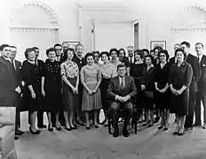 Роберт Макнамара, відомий як один із компаній "Whiz Kids" компанії Ford Motor, був призначений міністром оборони. Кеннеді відкинув наполягання лібералів обрати держсекретарем Стівенсона, а натомість звернувся з проханням очолити Держдепартамент до Діна Раска, позбавленого влади колишнього чиновника Трумена. Стівенсон погодився на неполітичну посаду посла в ООН. Незважаючи на побоювання критики щодо непотизму, батько Кеннеді наполягав на тому, щоб Роберт Ф. Кеннеді став генеральним прокурором, а наймолодший — Тед Кеннеді став «помічником президента», який консультував з усіх основних питань.[4] Макнамара та Діллон також стали важливими радниками кабінету.