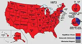 Ніксон, випереджав опитування протягом 1972 року, зосередився на перспективі миру у В'єтнамі та підйомі економіки. Він був обраний на другий термін 7 листопада 1972 року в одній з найбільших перемог на виборах в історії Америки. Він виграв понад 60% голосів населення, отримавши 47 169 911 голосів за 29 170 703 МакГоверна і здобув ще більшу перемогу в Колегії вибоців, отримавши 520 голосів проти 17 за МакГоверна. Незважаючи на сильну перемогу Ніксона, демократи зберегли контроль над обома палатами Конгресу. Після виборів багато консервативних південнодемократичних конгресменів серйозно обговорили можливість переходу партій дати республіканцям контроль над Палатою, але ці переговори були зірвані через скандало Вотергейт.