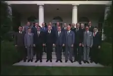 Незважаючи на те, що його база підтримки була применшена тривалими серіями відкриттів, Ніксон сподівався уникнути імпічменту. Однак одна з нещодавно випущених стрічок, "Стрічка паруючого пістолета", записана незабаром після вторгнення, продемонструвала, що Ніксону розповіли про підключення Білого дому до Вотергейту незабаром після того, як вони відбулися, і він затвердив плани щодо перешкоджають розслідуванню. У заяві, що супроводжує випуск стрічок 5 серпня 1974 року, Ніксон прийняв провину в тому, що ввів в оману країну, коли йому повідомили правду за скандалом Вотергейт, заявивши, що у нього пропала пам'ять. 7 серпня Ніксон зустрівся з лідерами республіканських конгресів, і йому сказали, що він зіткнувся з певним імпічментом в Палаті і що лише 18 сенаторів можуть проголосувати проти нього за статтями про імпічмент - набагато менше, ніж 34, які йому потрібні, щоб уникнути відставки.[25] Тієї ночі, знаючи, що його президентство фактично закінчилося, Ніксон остаточно прийняв рішення про відставку.
