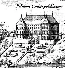 Архітектором палацу був Костянтино Тенкалла, архітектор польського короля Владислава IV та дизайнер Колони Сигізмунда перед сусіднім Королівським замком на честь Сигізмунда III Польщі. Палац добудував син Конецпольського Олександр у стилі барокової резиденції, імітуючи північну Італію та Геную. Вигляд палацу на варшавській панорамі 1656 року [1] Еріка Дальберга підтверджує це.