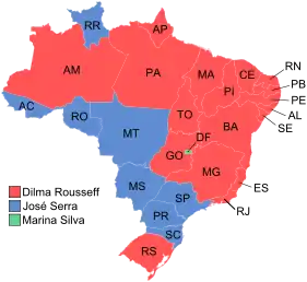 - Ділма Руссефф — кандидат від Партії трудящих, підтримана чинним (на той час) президентом Лула да Сілвою та урядовою коаліцією десяти партій;