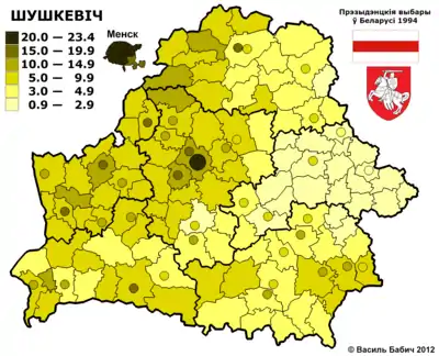 У першому турі Олександр Лукашенко набрав 44,82 %, В'ячеслав Кебич — 17,33 %, Зенон Позняк — 12,82 %, Станіслав Шушкевич — 10 %, Олександр Дубко — 6 %, Василь Новиков — 5 %.