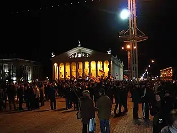 Увечері біля Палацу Республіки на Жовтневій площі в центрі Мінська почали збиратися прихильники Олександра Мілінкевича й Олександра Козуліна. Багато прилеглих магазинів і ресторанів зачинилися. Три прилягаючі до району станції метро (Жовтнева, Купалівська, Неміга) поїзда проїжджали без зупинки. Більшість людей зібралося біля великого телеекрана, по якому транслювалися новини телеканала ОНТ. Поруч працювали іноземні журналісти.