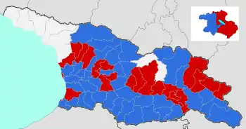 ![]() Результати першого туру за регіонами, синім кольором — регіони де перемогла Зурабішві, червоним — Вашадзе | ||||