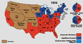Президентські вибори в США 1856 року були одними з найбільш напружених. Сформована Республіканська партія різко виступала проти рабства, тоді як демократи представляли республіканців як екстремістів, перемога яких призведе до громадянської війни. Внаслідок виборів демократ з Пенсільванії Джеймс Б'юкенен переміг двох основних конкурентів від республіканців та Американської партії «Нічого-не-знаю» (Know Nothing) і став 15-м президентом США.