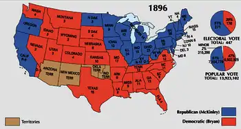 Президентські вибори 1896 року проходили 3 листопада та вважаються одними з найбільш драматичних в історії Сполучених Штатів. Кандидат від Республіканської партії Вільям Мак-Кінлі здобув перемогу над демократом Вільямом Дженнінгсом Браяном. Мак-Кінлі сформував коаліцію бізнесменів, кваліфікованих робітників та багатих фермерів. На Північному сході, верхньому Середньому заході та тихоокеанському узбережжі він володів широкою підтримкою. Браян був номінований від демократів, популістів та срібних республіканців (фракції республіканців, що виступали за випуск срібних грошей) з широкою підтримкою на Півдні, сільськогосподарському Середньому заході і в штатах Скелястих гір. Основними предметами передвиборчої кампанії були економічні питання: біметалізм, золотий стандарт, вільне срібло та тарифи. Глава республіканської кампанії Марк Ханна ввів багато сучасних виборчих технологій, які підтримувалися істотним виборчим бюджетом в $3,5 мільйона, що перевищує демократичний в 10 разів.