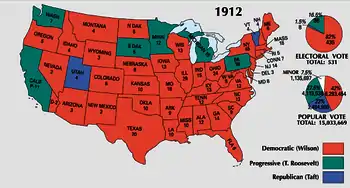 Президентські вибори 1912 року проходили 5 листопада та відрізнялися запеклою боротьбою між трьома основними кандидатами, двоє з яких вже були президентами раніше. Президент Вільям Тафт був знову висунутий Республіканською партією за підтримки консервативного її крила. Колишній президент Теодор Рузвельт, який не отримав підтримки республіканців, скликав свою власну конвенцію та створив нову Прогресивну партію (прозвану «Партією лосів»). Нова партія висунула Рузвельта і, крім цього, висувала своїх кандидатів на локальних виборах у великих штатах. Демократ Вудро Вільсон був номінований своєю партією лише після 46-го голосування в гострій конкурентній боротьбі завдяки підтримці одного з демократичних лідерів Вільяма Браяна. На загальних виборах він значно випередив обох конкурентів, незважаючи на підтримку лише 42 % виборців, і став вперше президентом-демократом з 1892 року. Ці вибори досі є останніми в історії США, на яких було більш ніж два основні кандидати та кандидат від третьої партії зайняв друге місце.