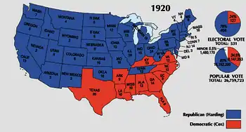 Внаслідок виборів Гардінг здобув переконливу перемогу. Кокс зміг перемогти лише в штатах Півдня. Вперше з часів громадянської війни один зі штатів Конфедерації (Теннессі) проголосував за республіканця. Під час цієї кампанії, молодий Франклін Делано Рузвельт, який претендував на пост віцепрезидента з Коксом, став відомий широкій публіці.