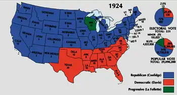 Президентські вибори в США 1924 року проходили 4 листопада. На них президент-республіканець Калвін Кулідж, що зайняв цей пост після смерті Гардінга, легко переміг та знову став президентом. Цьому значно допомогли економічний підйом, що почався в попередні роки, а також розкол серед демократів. Тоді як консервативне крило Демократичної партії висунуло в кандидати маловідомого колишнього конгресмена та дипломата Джона Дейвіса з Західної Вірджинії, ліберальна фракція підтримувала сенатора Роберта Лафайета, висунутого від Прогресивної партії. Це були перші вибори, в яких змогли взяти участь американські індіанці, що стали повноправними громадянами.