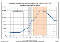 Динаміка населення з 1875 року в сучасних кордонах (Синя лінія: населення; Пунктир: відносна порівняльна динаміка населення землі Бранденбург; Сірий фон: період Третього рейху; Помаранчевий фон: період НДР)