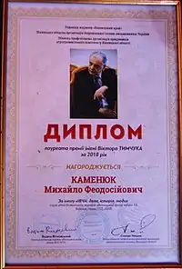 - Першим лауреатом Премії імені Віктора Тимчука став Михайло Каменюк // Сайт Вінницької обласної організації НСПУ «Краснослов». — 2018. — 26 жовтня.