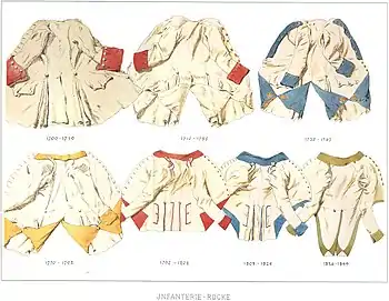 Якщо ж полку або роду військ був присвоений прибор білого металу, то ніжні чини мали ґудзики з міді або латуні лужені (вкрити оловом), а офіцери — срібні або (у XVIII сторіччі) дерев'яні, обтягнуті срібленою мідною фольгою[7]. Тасьма, китиці, шнурки, петлиці з тасьми у ніжних чинів були у цьому випадку білого кольору. Галуни, галунні петлиці, галунні погони у офіцерів і генералів були із срібного галуна; позументи, шиття, китиці, шнурки, еполети — срібні.