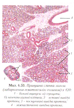 Її кінцеві секреторні відділи представлені білковими ацинусами, які побудовані з 10-15 білкових секреторних клітин — сероцитів.