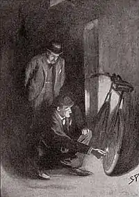 Підійшовши ближче, Холмс вивчає велосипедні шини Вайлдера та зазначає, що вони такі ж, як ті, що їм зустрілися першими на болоті, навіть з таким же дефектом. Холмс використовує Вотсон як драбину, щоб подивитися на нараді, що відбувається в будівлі.