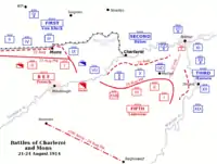 Також запеклі бої розгорнулися в межиріччі Самбру та Маасу біля бельгійського міста Шарлеруа. Тут 5-та французька армія протистояла 2-й і 3-й німецьким арміям. 21 серпня частини 2-ї німецької армії захопили кілька переправ через Самбр і 22 серпня форсували її великими силами. Потім розгорнулися запеклі бої, спочатку французи спробували перейти в наступ, за тим німці атакували ряд переправ на Маасі, але ці дії не принесли результатів атакуючим[16].