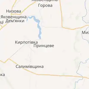 Село Принцева знаходиться за 0,5 км від села Кирпотівка. По селу протікає пересихаючий струмок з загатою, який через 3 км впадає в річку Грузька Говтва.