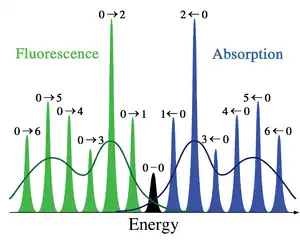 У збудженому стані положення атомів релаксуватиме внаслідок різних причин, наприклад, завдяки зіткненням з іншими молекулами. В результаті з великою ймовірністю через деякий час молекула опиниться в коливальному стані з коливальним квантовим числом 0, і випромінюватиме світло саме з цього стану. Наймовірніший перехід буде в коливальний стан із коливальним числом 2, що показано зеленою стрілкою вниз. Різниця енергій цих станів менша, ніж різниця енергій станів, між якими проходив перехід при збудженні, тому випромінювання відбуватиметься із Стоксовим зсувом.