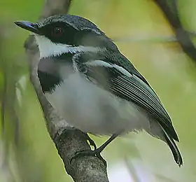 Дрібний птах, завдовжки 9,5–10 см і вагою 10,5–14,2 г. У самців верхня частина тіла синювато-сірого кольору з чорною маскою на обличчі, білою плямою на плечах і білими плямами на крупі. Нижня частина тіла біла з чорною смугою на грудях і чорнуватими стегнами. Крила чорні з білою смужкою, дзьоб і ноги чорні, а очі червоні. Самиці схожі за візерунком, але колір верхньої частини оливковий, крила коричневі та мають строкату грудку та крила. Короткий чорний хвіст облямований білим.