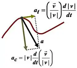 Перший член у цій формулі задає тангенціальну складову прискорення (тангенціальне прискорення) і характеризує зміну швидкості за величиною. Другий — нормальна складова прискорення (нормальне, або доцентрове прискорення) і характеризує зміну швидкості за напрямом. Зміна напрямку одиничного вектора завжди перпендикулярна до цього вектора, тому другий член в цій формулі нормальний до першого.