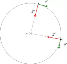 У випадку обертання матеріальної точки по колу із кутовою швидкістю , що не змінюється за модулем, вектор повного прискорення є перпендикулярним до вектора швидкості і спрямований до центра кола й дорівнює за абсолютною величиною