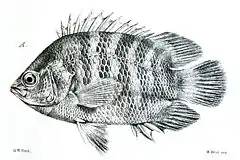 - Pristolepis fasciata (Bleeker, 1851) — смугастий пристолепіс; Індокитай, півострів Малакка, острови Суматра і Калімантан; довжина 20 см[4];