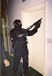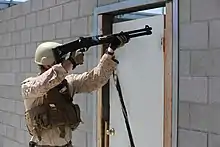 - Пробивний заряд військових США M1030, калібр 12, довжина гільзи 2¾ inch (70 мм). Куля вагою 40 грамів (1.4 унцій) створена зі сталевого порошки який з'єднано воском.[2][3]