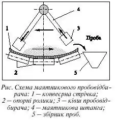 Пробовідбирач (рис.) складається зі зварної рами, на якій закріплена маятникова штанга 4 зі скреперним відсікачем проб 3 і приводів дугового і вертикального переміщення. Принцип дії маятникового пробовідбирача полягає у згрібанні через визначені проміжки часу зі стрічки конвеєра порції за допомогою відкритого спереду і знизу скреперного ковша. При робочому ході ківш знаходиться в нижньому положенні, за допомогою механізму дугового переміщення рухається за траєкторією відповідною радіусу кривизни стрічки конвеєра. При цьому скрепер знімає з конвеєра стрічку матеріалу (точкову пробу). При зворотному ході механізмом вертикального переміщення скреперний ківш піднімається угору і над потоком матеріалу повертається у вихідне положення. Маятникові пробовідбирачі функціонують у автоматичному режимі.