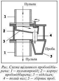 Пробовідбирач (рис.) складається з вертикального корпуса 2 з фланцями для приєднання до пульпопроводу 1 і пробовідсікача 3, що обертається в горизонтальній площині на полому валу 4. Потік пульпи періодично перетинається секторним відсікачем, при цьому порція пульпи проходить через щілину відсікача у сектор і далі по полому валу надходить у збірник 5. Щілинні пробовідбирачі функціонують у автоматичному режимі.