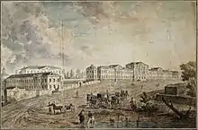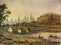 Перебування В.П. Стасова в Петербурзі спонукало до передачі будівництва московському архітекторові. Ним став Шестаков Федір Михайлович. В Москві споруди поєднали з декоративними ґратами, пофарбованими в чорний колір, а труби водовідведення - в червоний колір. Згодом авторство віддали архітектору Доменіко Жилярді. Лише архівні розшуки повернули авторство петербурзькому архітекторові.