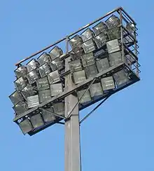 дії, яку призначено для освітлення великих площ, особливо спортивних споруд, промислових підприємств, портів, великих станцій, зокрема вантажних і сортувальних станцій, а також на концертах або для освітлення архітектурних пам'яток. Обов'язковою вимогою для стадіонів, є наявність у верхніх ярусах багатьох професійних спортивних споруд, низки прожекторів або освітлювальних щогл з прожекторами та огородженими майданчиками для розміщення двох інженерів, які обслуговують ці системи. Це обумовлюється тим, що спортивні змагання у вечірній або нічний час, краще задовольняють вимоги глядачів, оскільки більшість у денний час, мають роботу або інші зобов'язання. Основним спонуканням для цього, також, є маркетинг телебачення, особливо у таких видах спорту, як футбол, який покладається на гроші від продажу телевізійних прав для фінансування цього виду спорту. Деякі спортивні майданчики, які не мають постійних прожекторів, можуть використовувати пересувні тимчасові установки.